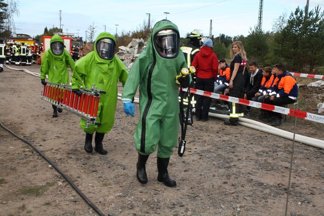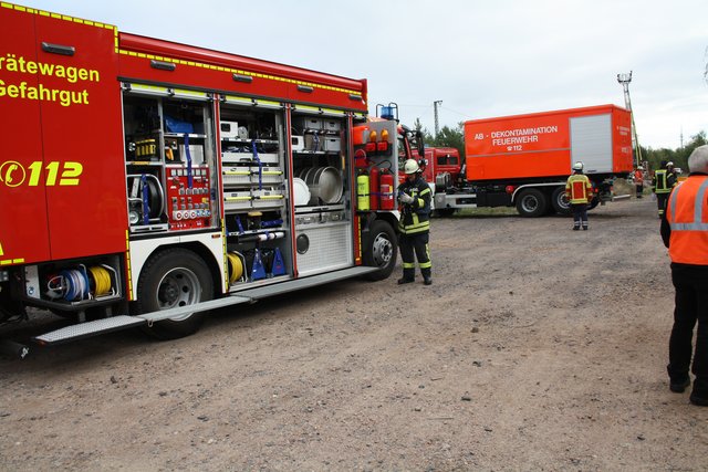 Folgender Fall wurde simuliert: Ein Lokführer wollte einen Waggon ankuppeln und bemerkte dabei, dass aus dem Wagen eine unbekannte Flüssigkeit ausläuft. Der Mann konnte aus dem Führerstand noch die Rettungsleitstelle alarmieren, bevor er bewusstlos zusammenbrach. Die Feuerwehren Buchholz und Trelde waren zuerst am Einsatzort und alarmierten dann verschiedene weitere Kräfte nach, u.a. die Fachzüge "Gefahrgut" sowie "Spüren & Messen". Die Einsatzleitung hatte Kreisbrandmeister Volker Bellmann.