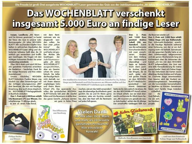 - Gratulation! Aus unzähligen - oftmals liebevoll gestalteten - Einsendungen für das knifflige Quiz unserer Jubiläumsausgabe "50 Jahre WOCHENBLATT" wurden diese drei Leserinnen und Leser ausgelost: Uta Resemann aus Winsen (Mitte), Tobias Stage aus Hollenstedt (re.) und Andrea Lukaß aus Asendorf