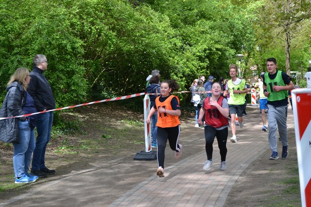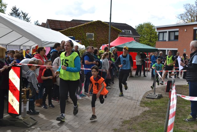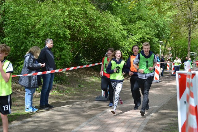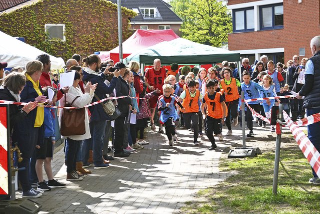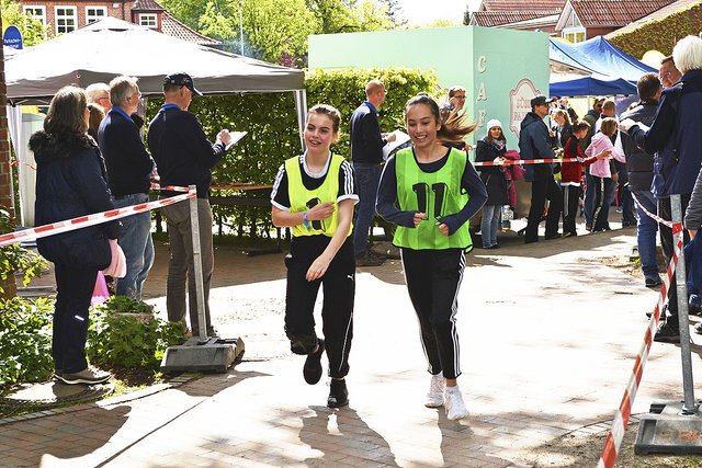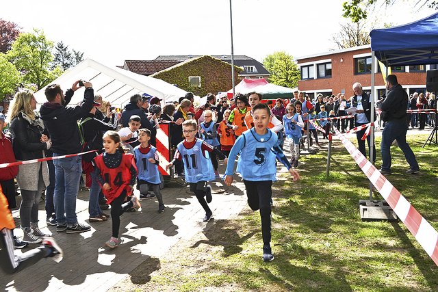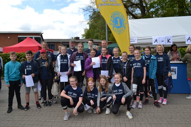 Das war bereits um 11.30 Uhr erreicht. Schulen aus dem gesamten Landkreis beteiligten sich an der Aktion und drehten Runden für den guten Zweck. Auch mancher Sponsor schickte Läufer auf die Strecke, so zum Beispiel das Kabel- und Rohrleitungsbauunternehmen Hoth, das auch die 6c des Gymnasiums am Kattenberge mit T-Shirts mit der Aufschrift "Heute schon gebaggert?" ausgestattet hatte, oder der Lebensmitteldiscounter Aldi.