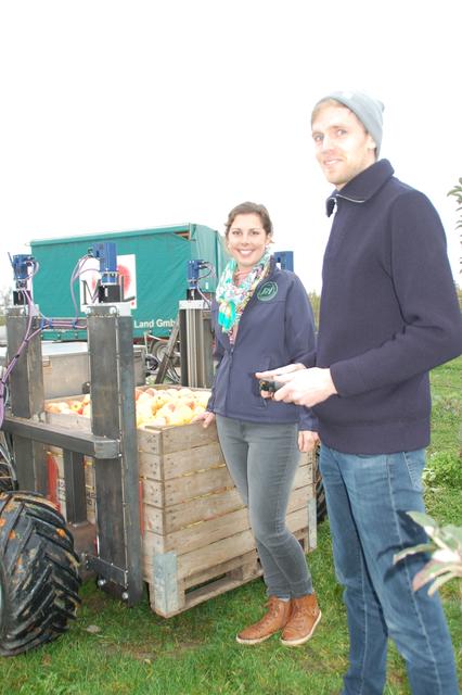 Ziel dieses Projektes ist der funktionsfähige Prototyp eines Fahrzeugs, das autonom durch Obstplantagen navigiert und dabei den Transport von leeren und gefüllten Kisten übernimmt. Es soll bei der Ernte helfen, indem es dem Pflückpersonal mit einer Kiste folgt, in der das Obst abgelegt wird. Sobald die Kiste komplett gefüllt ist, transportiert das Fahrzeug diese zu einem festgelegten Abstellplatz und kehrt mit einer leeren Kiste zurück. "Diese Anwendung richtet sich an kleine bis mittelgroße Betriebe mit einer Plantagengröße bis ca. zehn Hektar, die bereits großes Interesse an diesem Projekt zeigten", sagt Mechatronic-Ingenieurin Elisabeth Wahlen von Kooperationspartner PWH Landmaschinentechnik in Jork, wo das Fahrzeug bis auf das elektronische Innenleben zusammengebaut wurde.