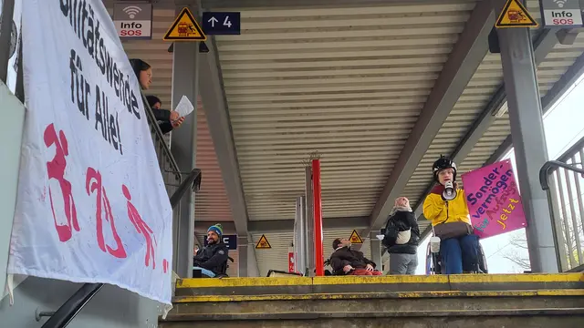 Mit einer außergewöhnlichen Aktion haben Rollstuhlfahrende am Montagmittag am Bahnhof Buxtehude ein deutliches Zeichen gesetzt: Am Aufgang zum Gleis 2 wurde die Aktivistin Cecile Leconte mithilfe eines improvisierten Seilaufzugs in ihrem Rollstuhl nach oben gezogen. Begleitet von Bannern, Plakaten und Durchsagen per Megaphon machten die Demonstrierenden auf ihre Situation aufmerksam.