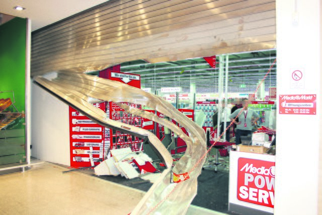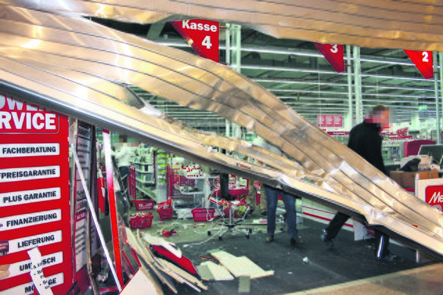 Durch die Wucht es Aufpralls wurden die Stahltore eingedrückt und eine Kasse im Inneren des Marktes komplett zerstört. Anschließend drangen die Diebe in die Verkaufsräume ein und entwendeten angeblich Handys und Mac-Books. Bei der anschließenden Flucht wurden sie von der Polizei gestellt.