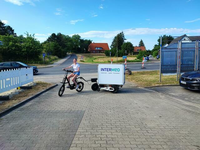 Und so läuft es ab: Die Kuriere sammeln die Proben ein und bringen sie mit dem Auto zum Umschlagsplatz. Dort werden die Boxen in den Anhänger geladen und los geht die Fahrt zu dem sieben Kilometer entfernten Labor. Die E-Bikes und vor allem die Anhänger sind so konzipiert, dass sie genau durch die eingeengte Fahrradfahrspur auf der Elbbrücke passen. Der Clou: Auch der Anhänger hat einen Elektroantrieb, sodass der Radfahrer fast gar nicht merkt, dass er etwas hinter sich herzieht. Und: Bei Bedarf kann der Anhänger auch abgekoppelt und mit der Hand bewegt werden.