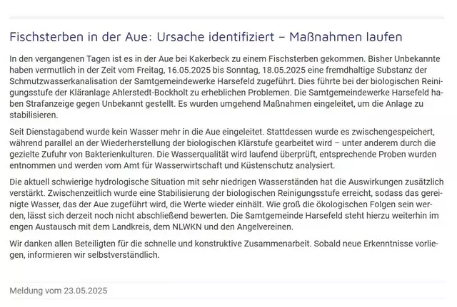 Der Landkreis hat inzwischen Wasserproben entnommen, deren Auswertung noch aussteht. Parallel laufen Gespräche mit dem NLWKN und dem Anglerverband. Der Angelverein „Petri Heil“ hat vorsorglich ein Angelverbot für die betroffenen Aue-Abschnitte ausgesprochen. Wie lange dieses bestehen bleibt, hängt auch von den laufenden Gewässeranalysen ab. "Zum jetzigen Zeitpunkt ist es noch zu früh, um die langfristigen Folgen für die Gewässerqualität zu beurteilen", so Beneke.