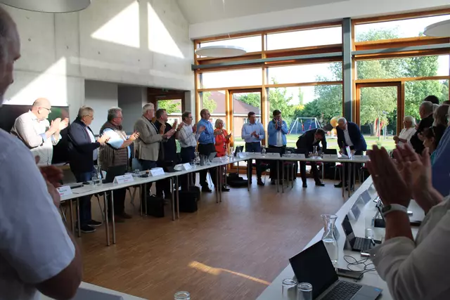 Noch bevor die Sitzung im Gemeindehaus Wenzendorf losging, erhob sich Manfred Cohrs, Ratsvorsitzender und Bürgermeister der gastgebenden Gemeinde, um dem neuen Samtgemeinde-Bürgermeister einen Blumenstrauß zu überreichen. Zusätzlich schenkte er ihm die Chronik von Wenzendorf. Sie soll ihm als ein gutes Beispiel für eine erfolgreiche Gemeinde dienen.