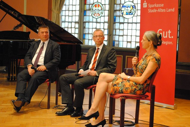 sb. Stade. Mit vielen guten Wünschen ist Dieter Kanzelmeyer (61) heute im Königsmarcksaal des Stader Rathauses in den Ruhestand verabschiedet worden. In der Feierstunde kamen unter anderem Weggefährten wie Dr. Sabine Schormann von der Niedersächsischen Sparkassenstiftung, Thomas Mang vom Sparkassenverband Niedersachsen, die Unternehmer Helge Geier (NDB, Stade) und Peter Bartels (Shipping & Chartering GmbH, Jork) sowie der neue Vorstand mit Wolfgang Schult und Michael Senf zur Wort. In kurzweiligen Interviews plauderten sie über ihre Begegnungen mit Dieter Kanzelmeyer und wünschten ihm unter anderem Gesundheit und Entschleunigung im Ruhestand. Wolfgang Schult, der viele Jahre mit Dieter Kanzelmeyer zusammen im Sparkassen-Vorstand agierte, verabschiedete sich mit den herzlichen Worten: "Dieter, bleib wie Du bist!"