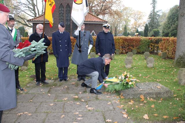 Bürgermeister Jan-Hendrik Röhse (re.) legte einen Kranz auf dem Alten Friedhof in Buchholz nieder - im Beisein von Mitgliedern der Reservistenkameradschaft
