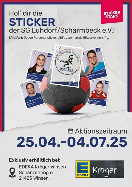 Der Sammelspaß beginnt: Mit einem eigenen Stickeralbum bringt die SG Luhdorf/Scharmbeck ab Freitag, 25. April, das Vereinsleben ins Supermarktregal – und direkt in die Sammelalben der Mitglieder, Fans und Unterstützer. Ob Minis, Senioren oder Funktionsteam: Wer zur SG gehört, wird jetzt zum Sammelstar. Exklusiv bei Edeka Kröger im Schanzenhof (Schanzenring 6) ist das Stickeralbum ab Freitag, 25. April, erhältlich. In dem Heft finden sich 330 verschiedene Motive – von den jüngsten...