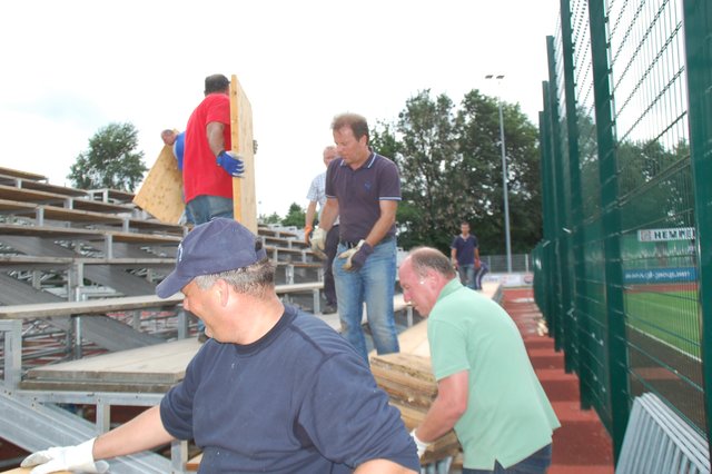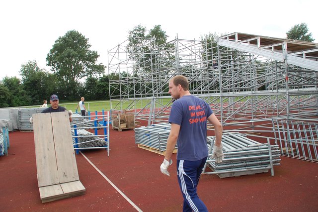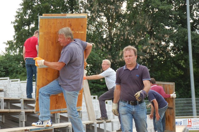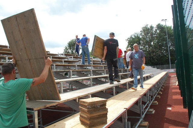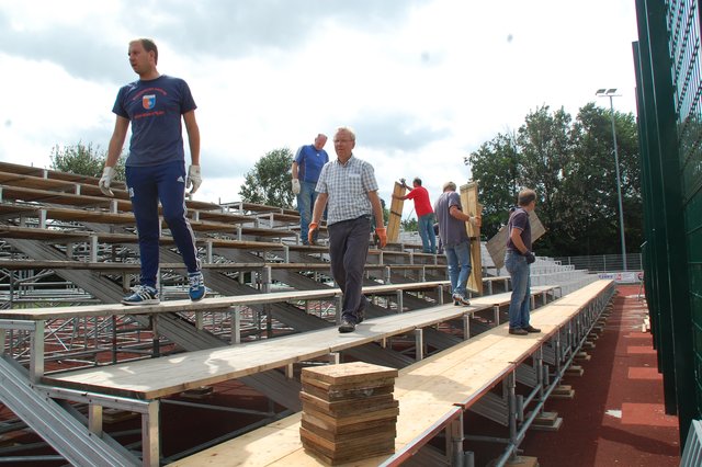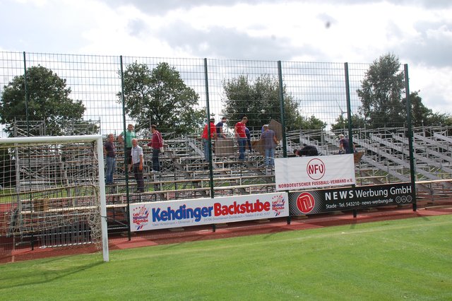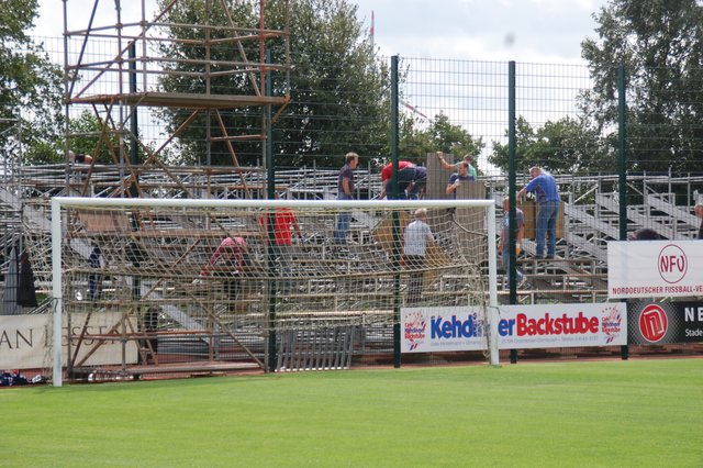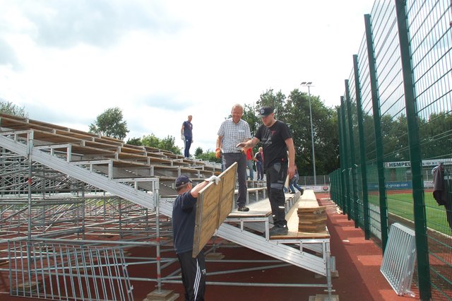ig. Drochtersen. Die Ampeln stehen auf grün für das große Ereignis: Viele fleißige Helfer sorgen im Kehdinger Stadion derzeit für den Aufbau der ersten Tribünen für das Hammerspiel der SV Drochtersen/Assel am Samstag, 20. August, im DFB-Pokal gegen Borussia Mönchengladbach. Die erste Tribüne steht fast, bietet Platz für mehr als 1.000 Fans. Weitere Tribünen sollen in den nächsten Tage folgen. Im Helferteam dabei ist auch Ehrenbürgermeister Hans-Wilhelm Bösch. Sein Motto: "Da muss man einfach...
