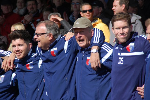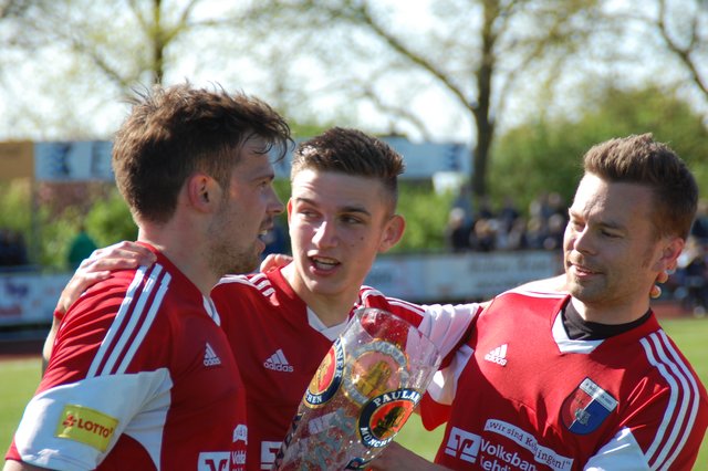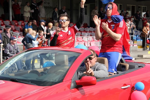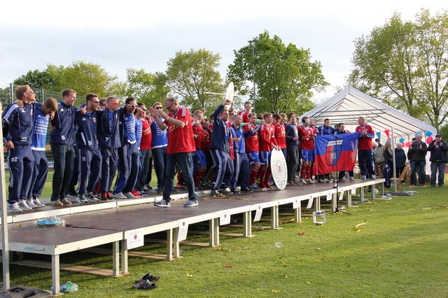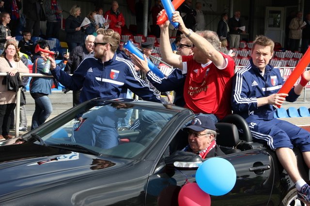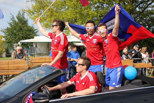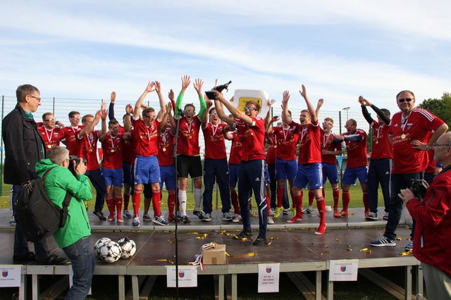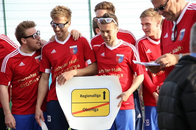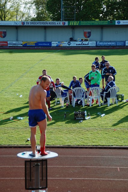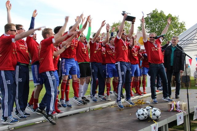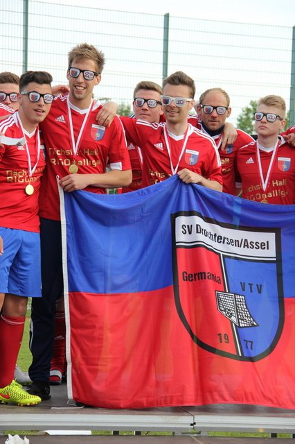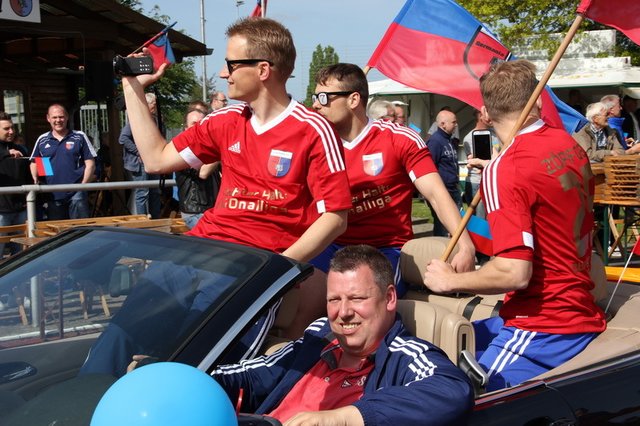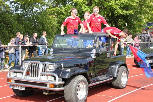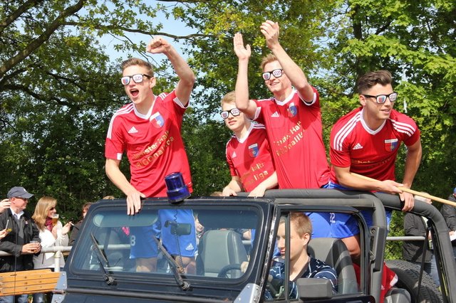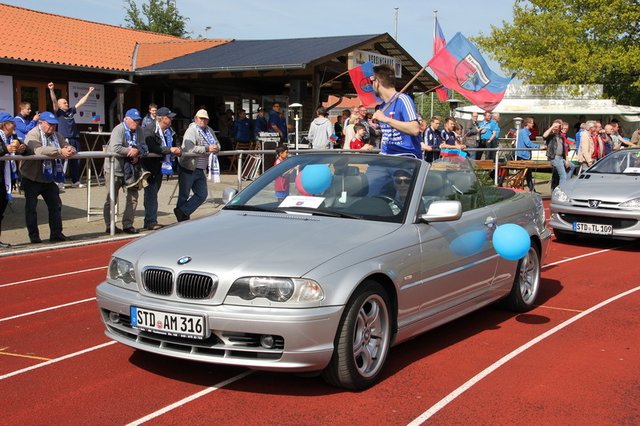 Volksfest im Kehdinger Stadion / Mit 24 Cabriolets durch die Gemeinde ig. Drochtersen. Die Trilogie ist vollendet. Die SV Drochtersen/Assel schreibt ein Stück Fußball-Geschichte. Drei Teams, drei Meister! Die Erste Herren steigt in die Regionalliga auf. Die „Zweite“ in die Landesliga und D/A III vertritt die Kehdinger Farben in der Bezirksliga. Damit nicht genug: D/A III holte den Kreispokal, die fünfte Herren die Kreisplakette. „Was will man mehr. Einmalig. Die Fußball-Götter tragen Blau-Rot“,...