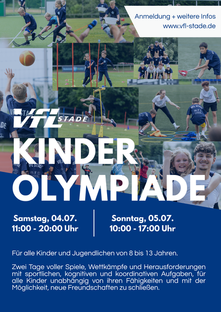 Der VfL Stade lädt alle Kinder & Jugendlichen im Alter von 8 bis 13 Jahren am ersten Wochenende der Sommerferien (04.07./05.07.) zur VfL-Kinder-Olympiade 2026 ein. Die Teilnahme ist an keine Mitgliedschaft gebunden. Alle jungen Staderinnen und Stader, die Zeit und Lust haben, sind herzlich eingeladen sich anzumelden. Es warten zwei Tage mit Spiel, Wettkampf, Herausforderung und vor allem Spaß auf euch! Alle Inhalte sind so konzipiert, dass es keinerlei Vorkenntnisse braucht. Alle Kinder &...
